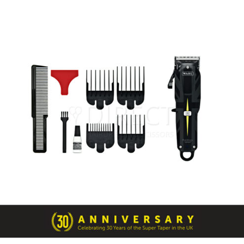 This Wahl limited edition kit contains the Cordless Super Taper, 4 guide combs (#1-4), flat top comb, blade oil, cleaning brush, blade guard and instruction book.